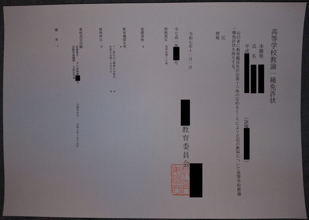 なお、強気にも「合格するはず!」と思い、申請手続き用の書類は事前に準備を進めており、加えて在住地域の教育委員会は「合格証明書又は合格証書のコピー」で申請可能だったので、有料の必要アイテム(戸籍抄本、普通為替、レターパック等2)を合格発表当日に一気に調達し、受領した翌日には郵送で免許申請を行いました。今年度の合格者で最速の申請なんじゃないかと勝手に思っています。順調に行けば11月下旬には免許状が届くはず…(でしたが、結局12月の頭に受領しました:追記)。